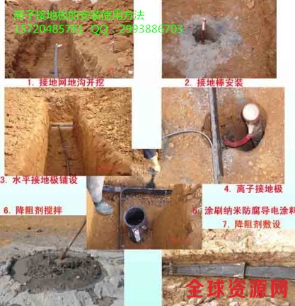 离子接地极的规格为直径55mm,标准长度3m。离子电极不得直接打入土壤中,必须预先钻孔。孔径大小直径约为110mm,钻孔完毕后组装离子接地极,焊接引出线,放入孔中底部;调制回填料成浆状;将浆状回填料缓缓注入接地极孔中,直至灌满为止;深埋离子接地极,若孔底部有较多泥浆,则需要采用加压泵加压灌浆。离子接地极与地网连接的引出线为95mm2铜绞线,95mm2铜绞线通过火泥熔接与地网进行连接。火泥熔接需要配备专用的火泥模具及火泥熔粉。